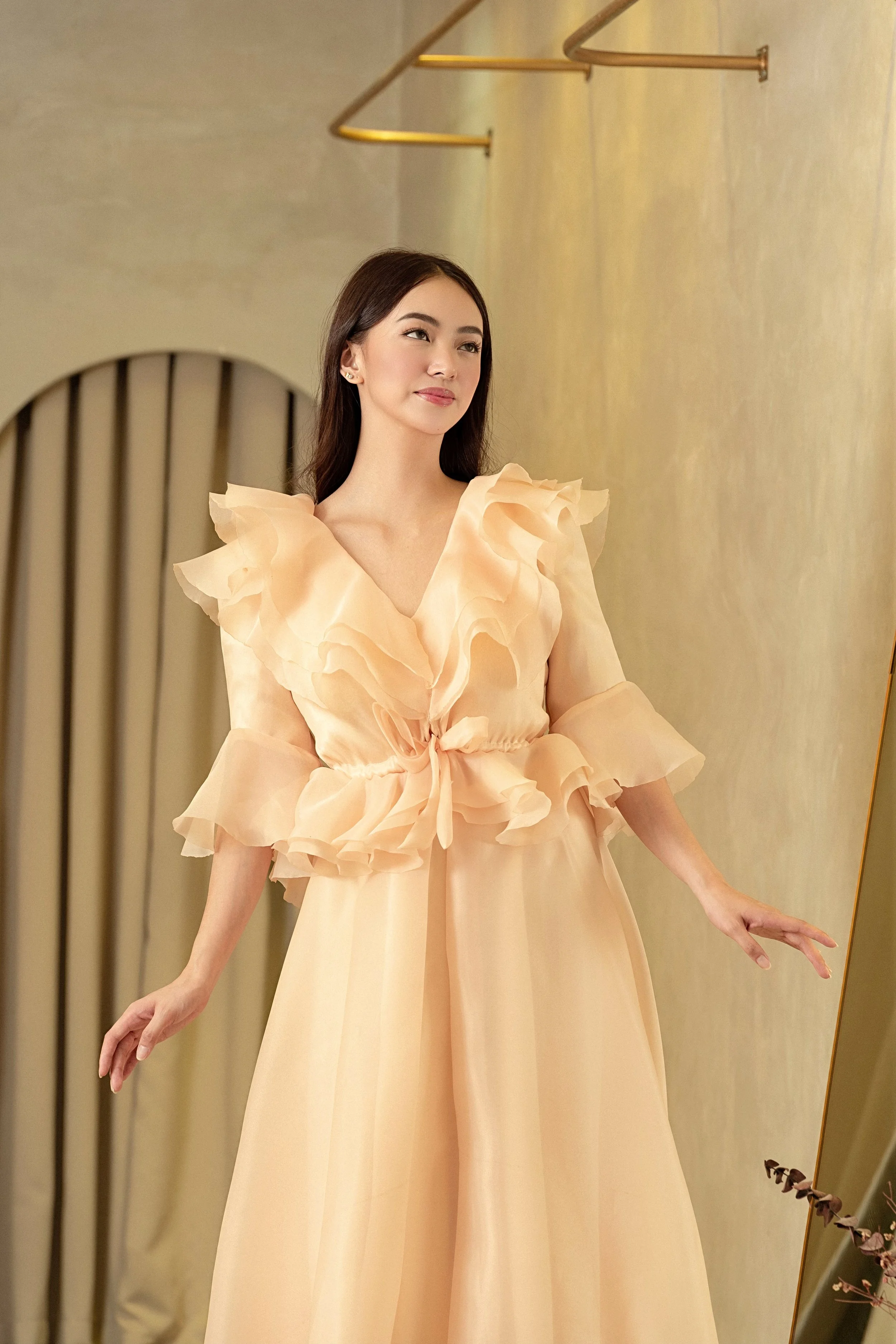 The standout feature of this dress is its multi-layered organza ruffles that elegantly cascade down the bodice and shoulders. These delicate, airy layers create soft movement, giving a dreamy and cloud-like effect.